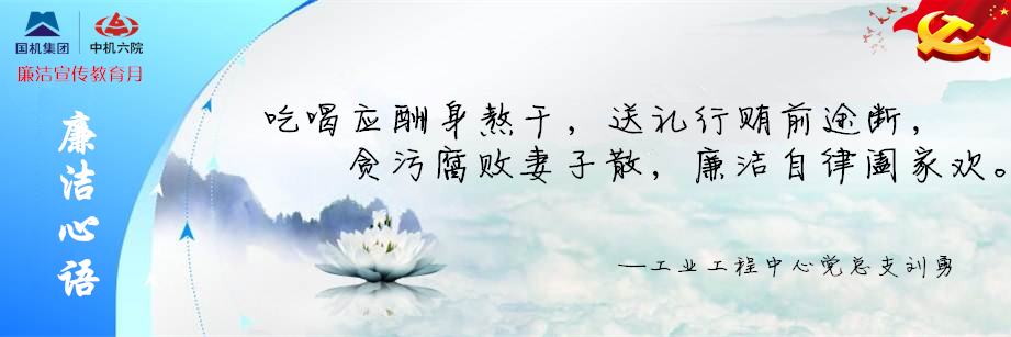 按照国机集团党委、纪委统一部署,9月份为“廉洁宣传教育月”。为切实推进中机六院廉洁文化建设,引导广大党员、员工增强遵纪守法的自觉性,追求健康的生活方式,树立高尚的道德情操,公司党委、纪委开展了“廉洁心语”征集活动。活动开展以来,公司各党总支、支部精心组织,党员领导干部积极带头,党员员工广泛参与。经过公司基层党组织筛选,共收到推荐作品120余幅。经评委会初选,现公布进入投票环节的入围作品20幅。
